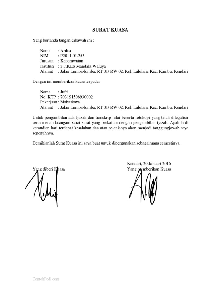 Tindakan berupa penawaran objek lelang, menandatangai ridalah lelang, menyerahkan serta menerima uang pinjaman, serta menandatangani semua berkas yang dibutuhkan dalam lelang. Seperti pengambilan ijazah, bpkp, bank, perwakilan, pengambilan dokumen maupun untuk yang lainnya. Surat kuasa pengambilan uang pada dasarnya sama dengan jenis surat kuasa lainnya, yaitu dokumen tertulis yang menerangkan pelimpahan kekuasaan dari satu pihak ke pihak lain untuk melakukan tugas tertentu. Surat kuasa pengambilan ijazah sarjana. Surat kuasa untuk pengambilan uang di bank, gaji, pengambilan bpkb, dan lain sebagainya, ada baiknya pihak yang diberi kuasa adalah keluarga sendiri, atau orang dekat yang bisa dipercaya untuk menghindari hal yang tidak diinginkan.